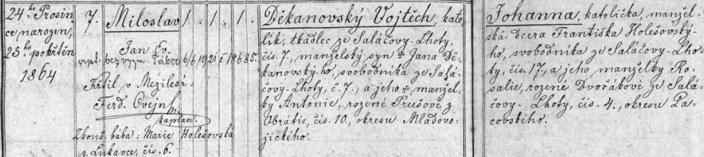Miroslav Jan Děkanovský, .. syn (Sohn des) + Vojtěcha Děkanovskehs, tkadlec (Weber) v Saláčove Lhote čis. 7 Johanny rodem (geborene) Holešovský …