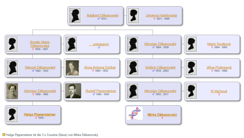 Ein Blick in den Stammbaum des DNA Matches zeigte, dass der Großvater Vojtěch (Adalbert) Děkanovský hieß und 1910 in Tučapy geboren wurde. Das konnte ich zunächst gar nicht wirklich glauben – Děkanovský!?!