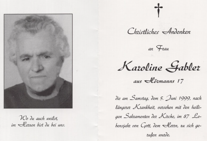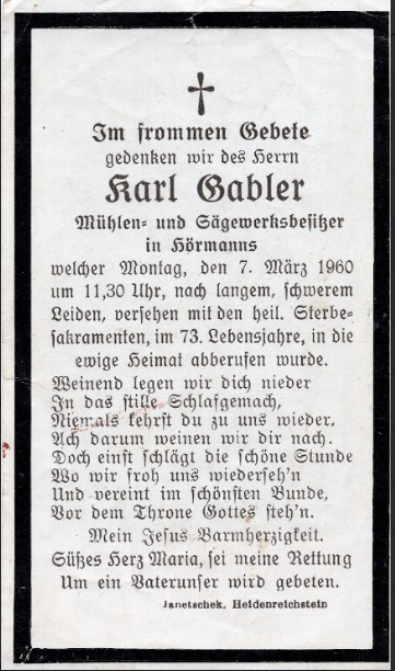 Franz Gabler, Müllermeister, starb 62jährig an Lungenbrand am 25. Jänner 1798 in Hörmanns 7(?)22, seine Witwe Elisabeth Gabler mit 87 Jahren an Entkräftung am 30. Juli 1821 bei ihrem Sohn Karl in Griesbach 12.23